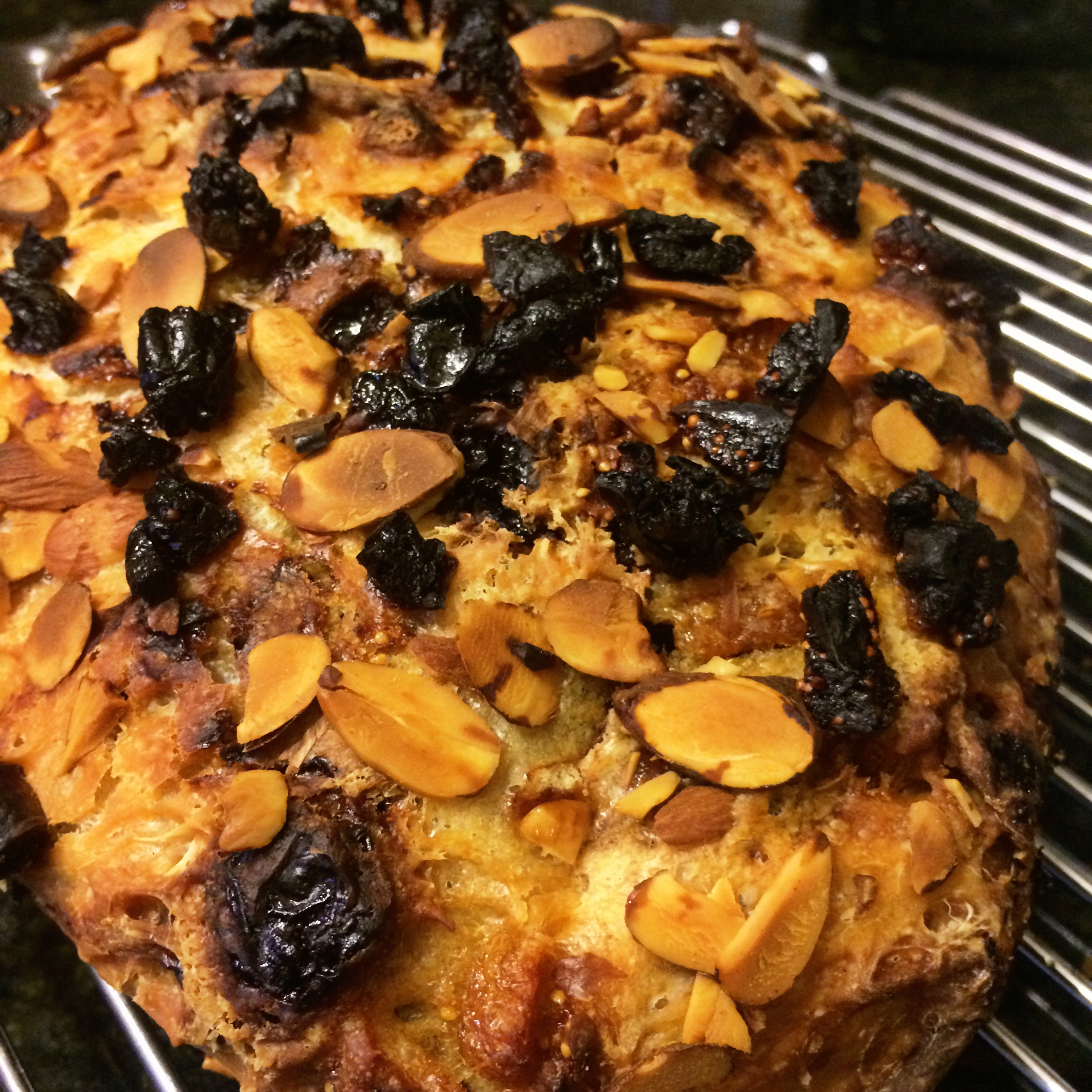 Prepare 12 hours in advance. Mix together flour, salt, yeast, and water until just blended. Dough will be sticky. Stir in chopped figs and cherries and let sit in a covered bowl for at least 12 hours.