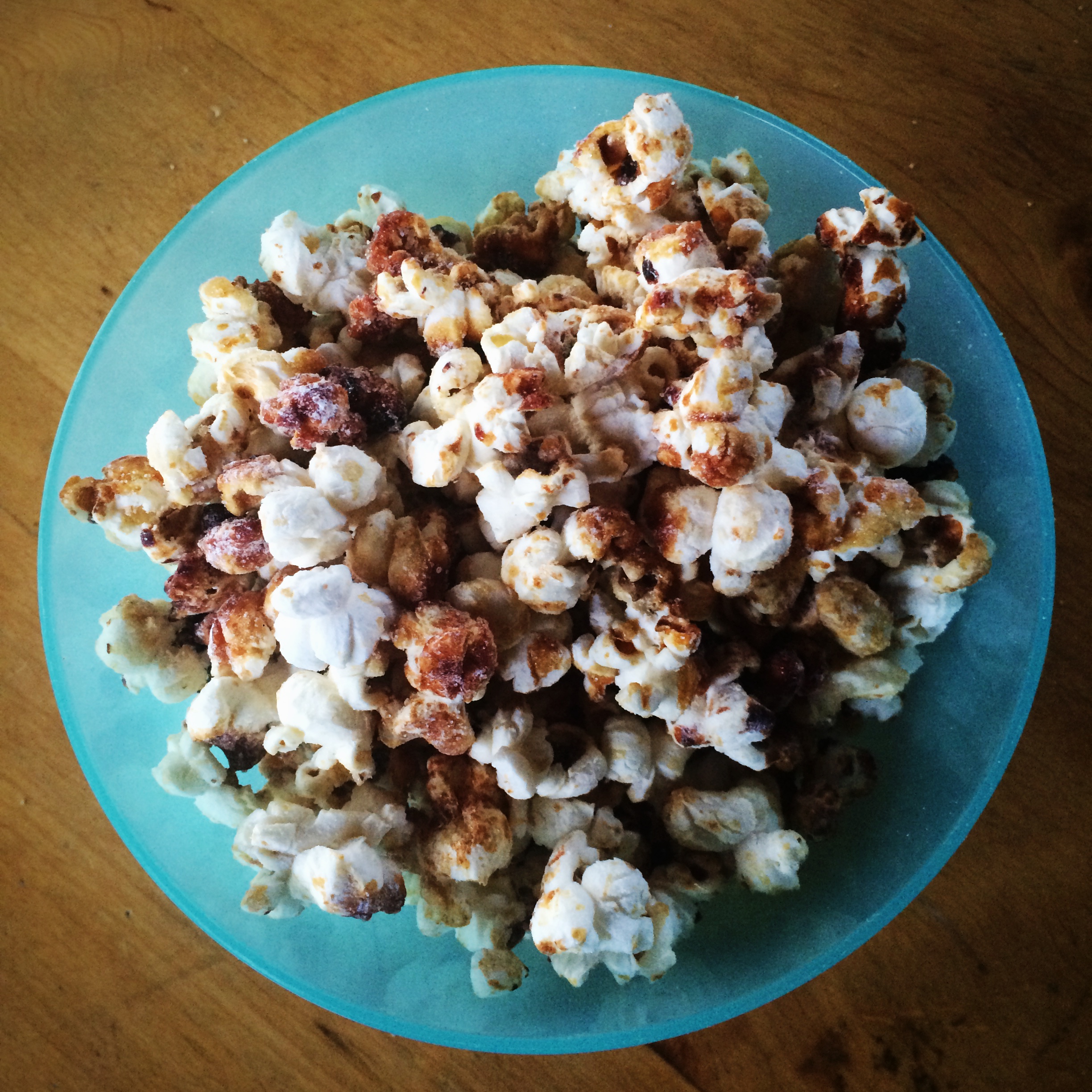 Heat the vegetable oil in a large pot over medium heat. Once hot, stir in the sugar and popcorn. Cover, and shake the pot constantly to keep the sugar from burning. Once the popping has slowed to once every 2 to 3 seconds, remove the pot from the heat and continue to shake for a few minutes until the popping has stopped. Pour into a large bowl, and allow to cool, stirring occasionally to break up large clumps.