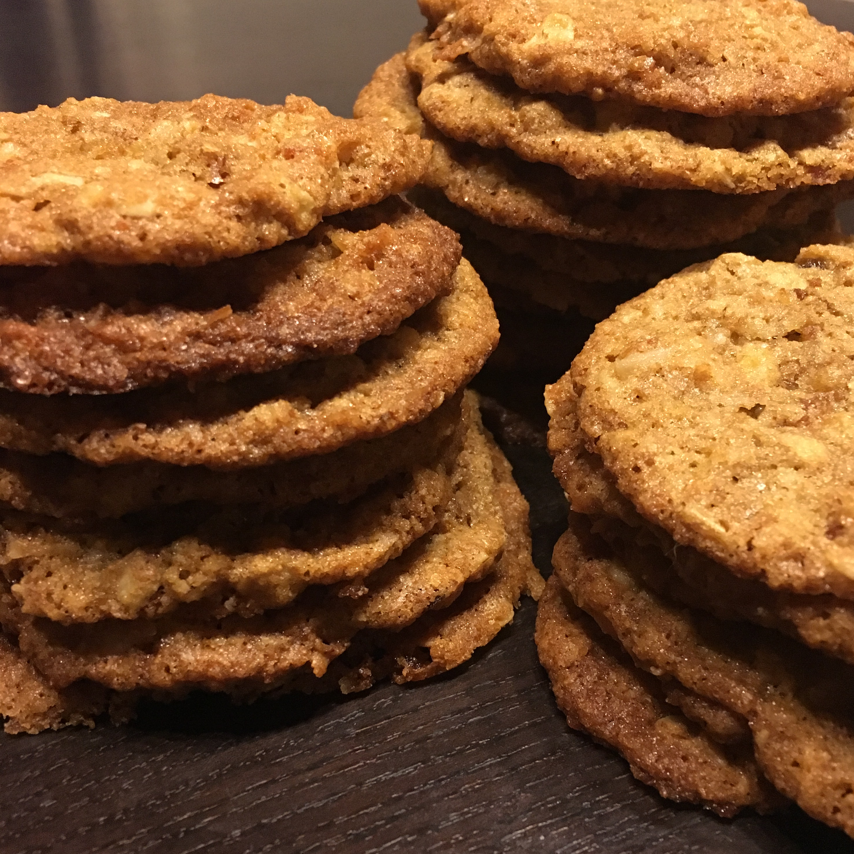In a separate bowl, combine the oats, wheat germ, flour, baking powder, baking soda and salt. Stir the dry ingredients into the creamed mixture. Finally, mix in the coconut, nuts, and dates. Drop by rounded spoonfuls onto ungreased cookie sheets.