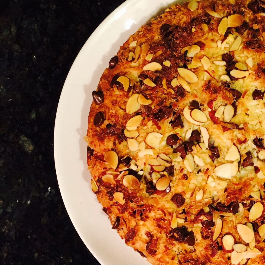 Sift together 1 3/4 cups flour, baking powder, and salt into medium bowl. Add shredded coconut and 1/2 cup almonds then set aside. Using electric mixer, beat sugar, butter, and lemon peel until light and fluffy. Add eggs 1 at a time, beating well after each addition. Beat in vanilla. Add flour mixture in 3 additions alternately with half and half in 2 additions, beating just until blended after each addition. Fold in half of bittersweet chocolate pieces. Spread batter evenly in prepared cake pan. Sprinkle remaining chocolate pieces over batter, then sprinkle with sweetened flaked coconut and almonds.