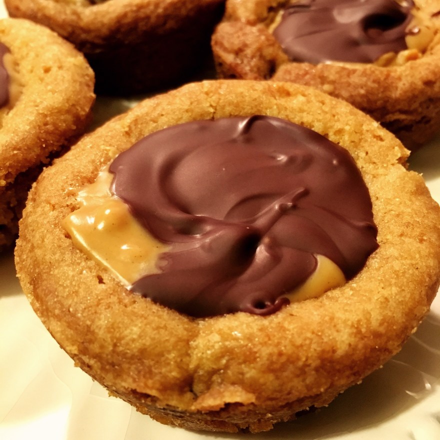 Remove from oven and use the back of a spoon to make an indentation in the dough. Add a small scoop of peanut butter and cover with a little bit of tempered chocolate. Refrigerate for a few minutes. Remove from muffin tin, cover when cool.
