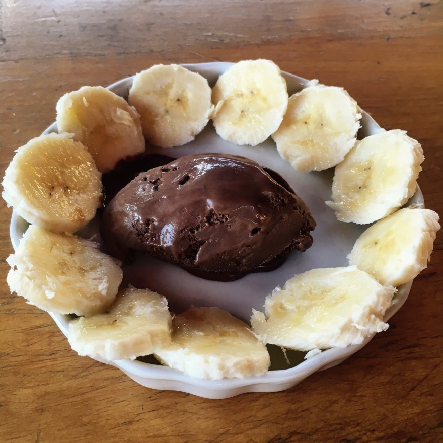 Freeze custard in an ice cream maker. When almost done, drop teaspoons of peanut butter into ice cream maker. Transfer to an airtight container and put in freezer to harden, 1 to 3 hours. Serve with bananas and or whipped cream.
