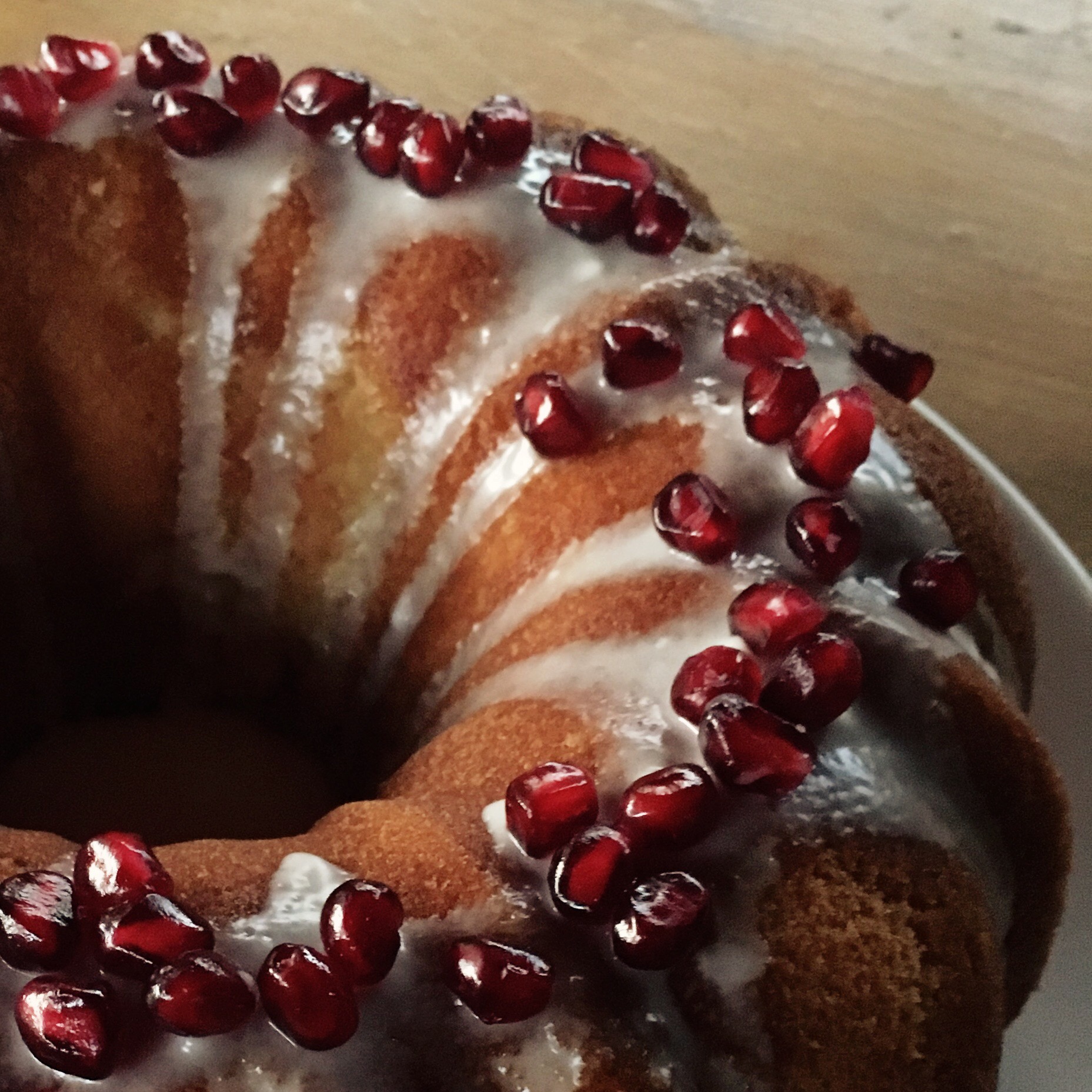 To make the glaze, whisk the confectioners’ sugar, 2 tablespoons of orange juice, and vanilla together. It will be very thick. Whisk in 1 or more Tablespoons of juice, depending how thick you’d like the glaze. Drizzle over cake. Sprinkle pomegranate seeds on top.