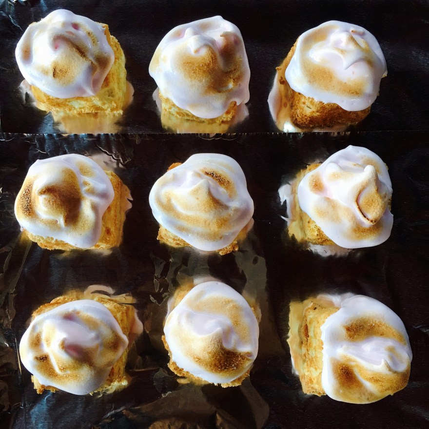 Add boiling water all at once and beat 5 to 7 minutes on high until light fluffy and good spreading consistency. Don’t overbeat or the mixture will become grainy. Frost cakes and use kitchen torch if you like that kind of thing.