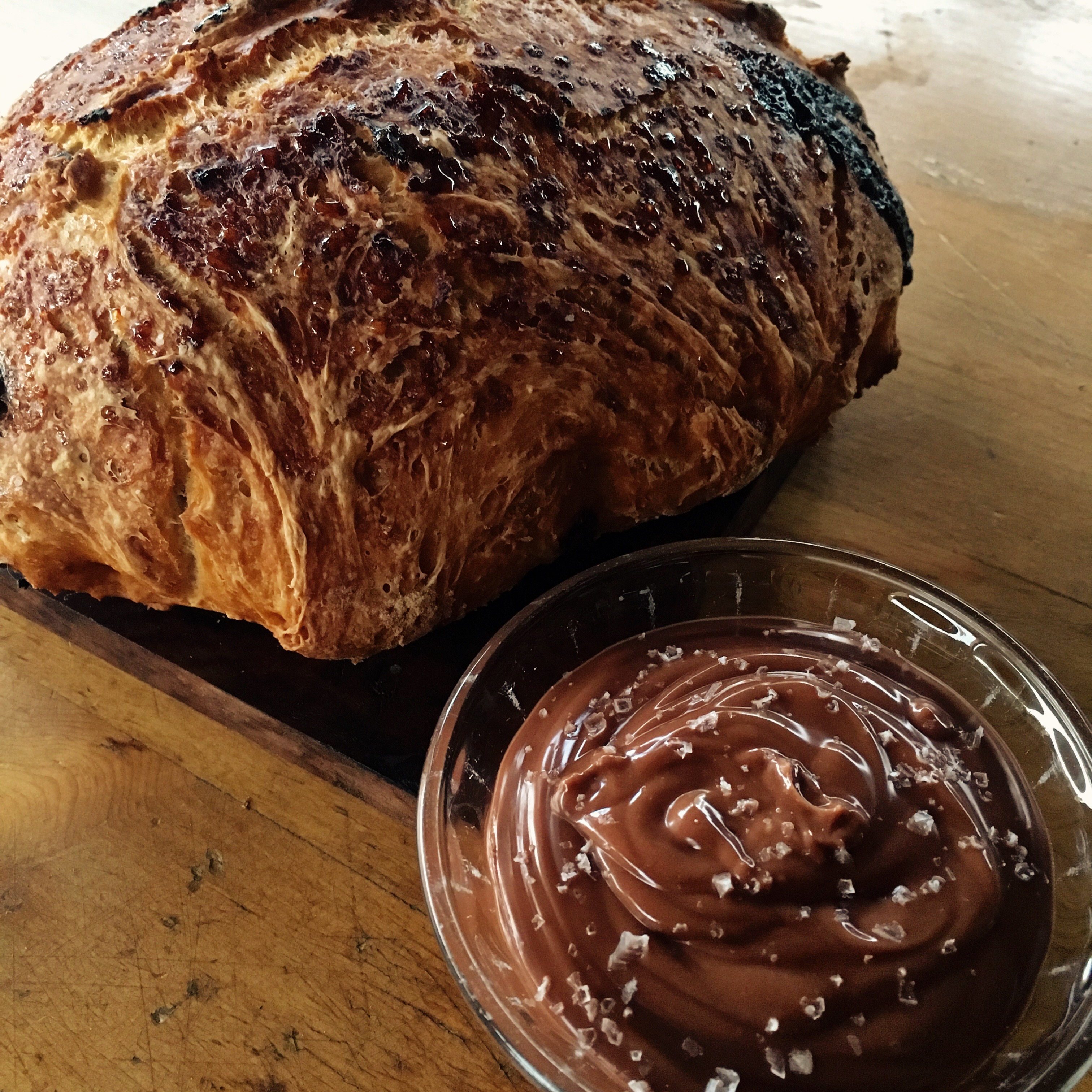 Heat chocolate chips in microwave in 30 sec increments until melted. Put aside and let cool. Mix into softened stick of butter by hand or in mixer. Sprinkle with flaked salt. Refrigerate while not using. Let sit out for a few minutes before serving.