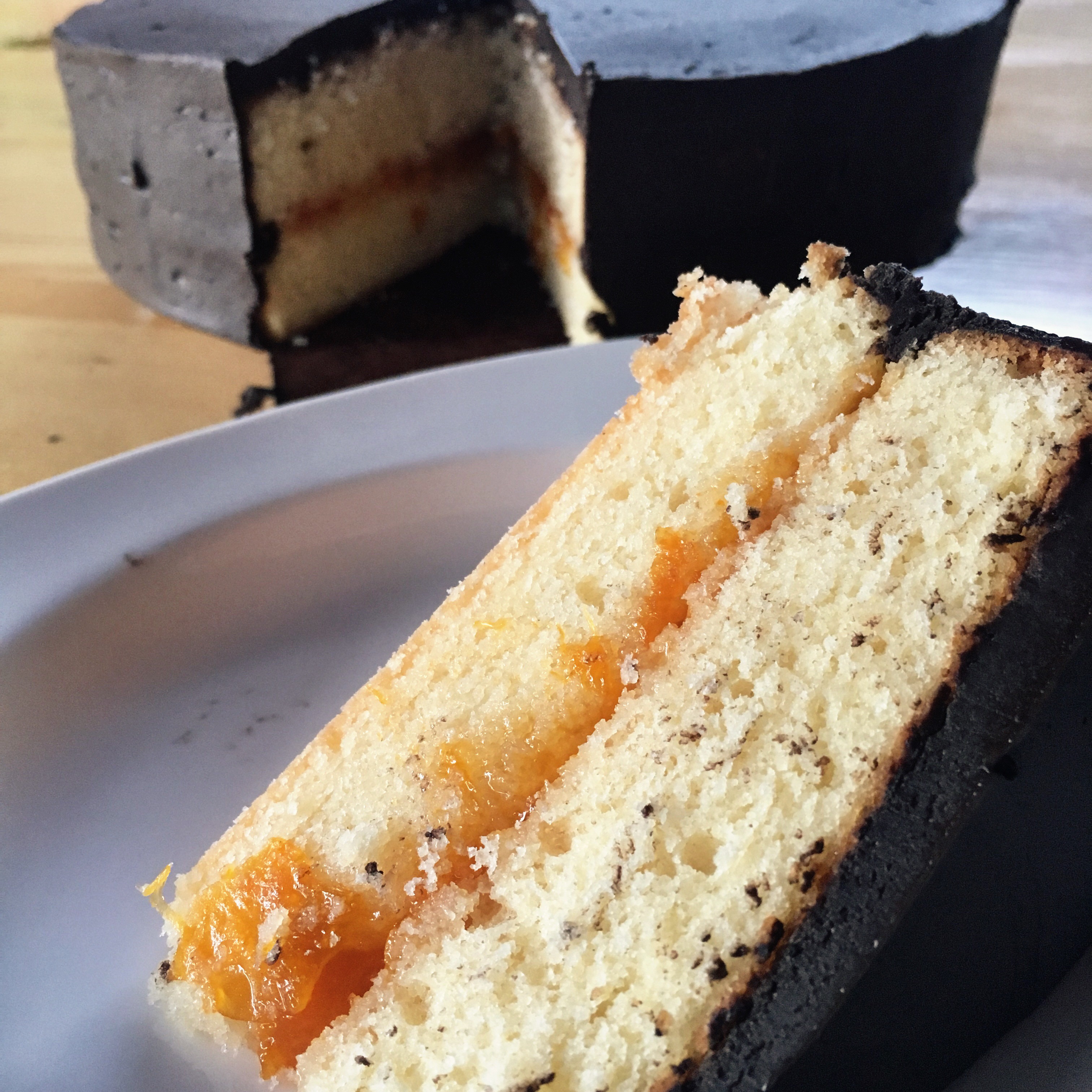 Congrats! You’ve made it halfway through the week. Celebrate with a chocolate frosted, vanilla cake filled with homemade apricot jam.