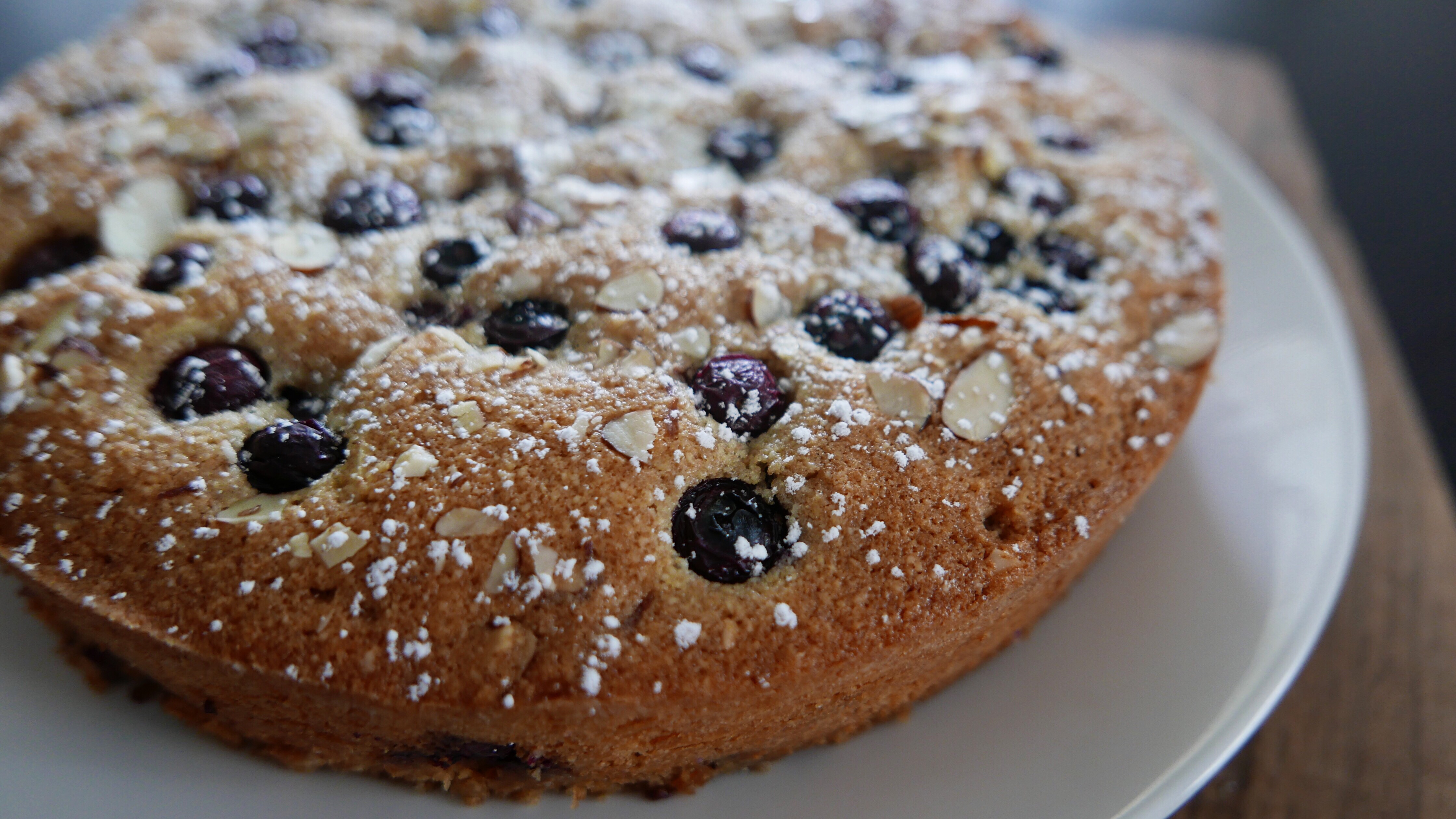 Reserve a small handful (8 to 10 blueberries) for later. Using a large spatula, gently fold the remaining blueberries into the cake batter. Transfer the batter into the greased cake pan, and smooth the top with a small offset spatula. Distribute the remaining blueberries on top, gently pressing them into the batter. Top with the remaining sliced almonds.