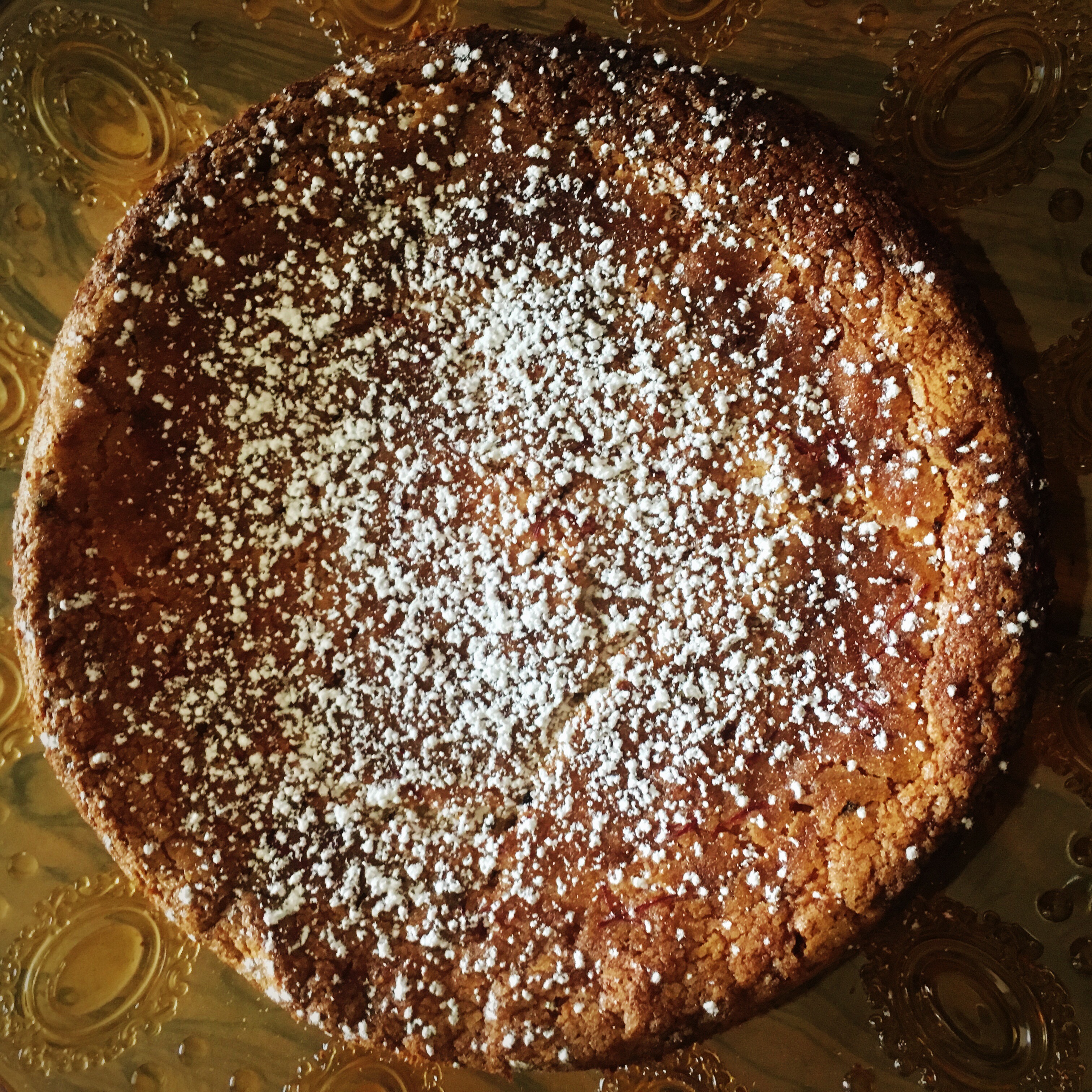 Transfer batter to springform pan and gently tap against work surface to release air bubbles. Sprinkle top evenly with remaining 1 1/2 tablespoons sugar. Bake until puffed and golden and a wooden pick or skewer inserted in center of cake comes out clean, about 45 minutes. Brush on glaze. Cool cake in pan on a rack 10 minutes, then run a thin knife around edge of pan and remove side of pan. Cool cake to room temperature, about 1 1/4 hours.