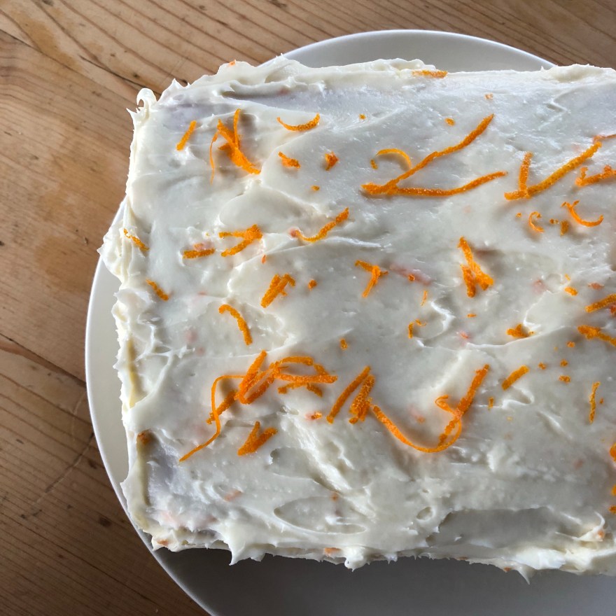 For the frosting, combine butter and cream cheese in a mixing bowl and cream until smooth. Add powdered sugar a cup at time until whipped smooth. Add juice and zest and mix until well combined.