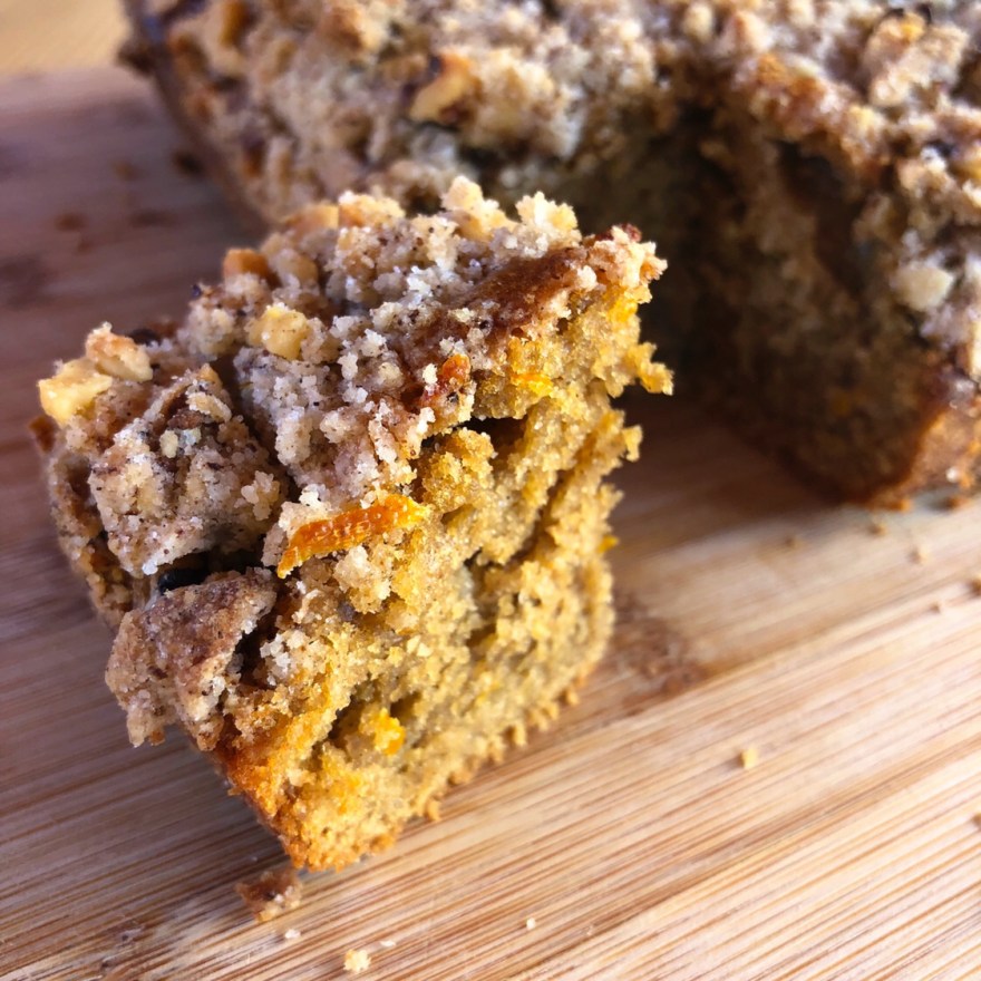 Put the remaining ingredients in another bowl and whisk them to blend. Pour the wet ingredients over the dry and stir – don’t beat – to mix. Stir only until you’ve got an evenly moistened batter. Scrape the batter into the prepared pan and top with a thick, even layer of the crumbs. Pat the crumbs ever so gently into the batter.