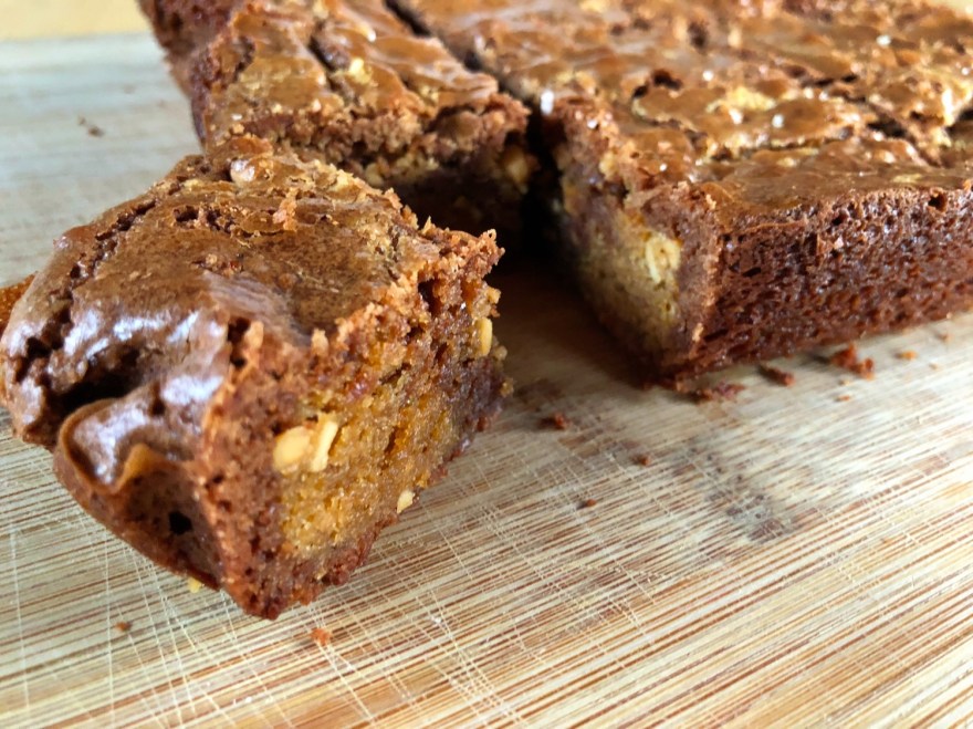 Assemble brownies: Spread a thin layer of brownie batter (about 1/3 of total batter, but no need to be exact) in bottom of prepared baking pan. Dollop peanut butter batter all over in big spoonfuls. Dollop remaining brownie batter in pan, aiming, if you can, between the peanut butter dollops. Use a butter knife to swirl the batters together in loose figure-8s. Sprinkle chips all over.