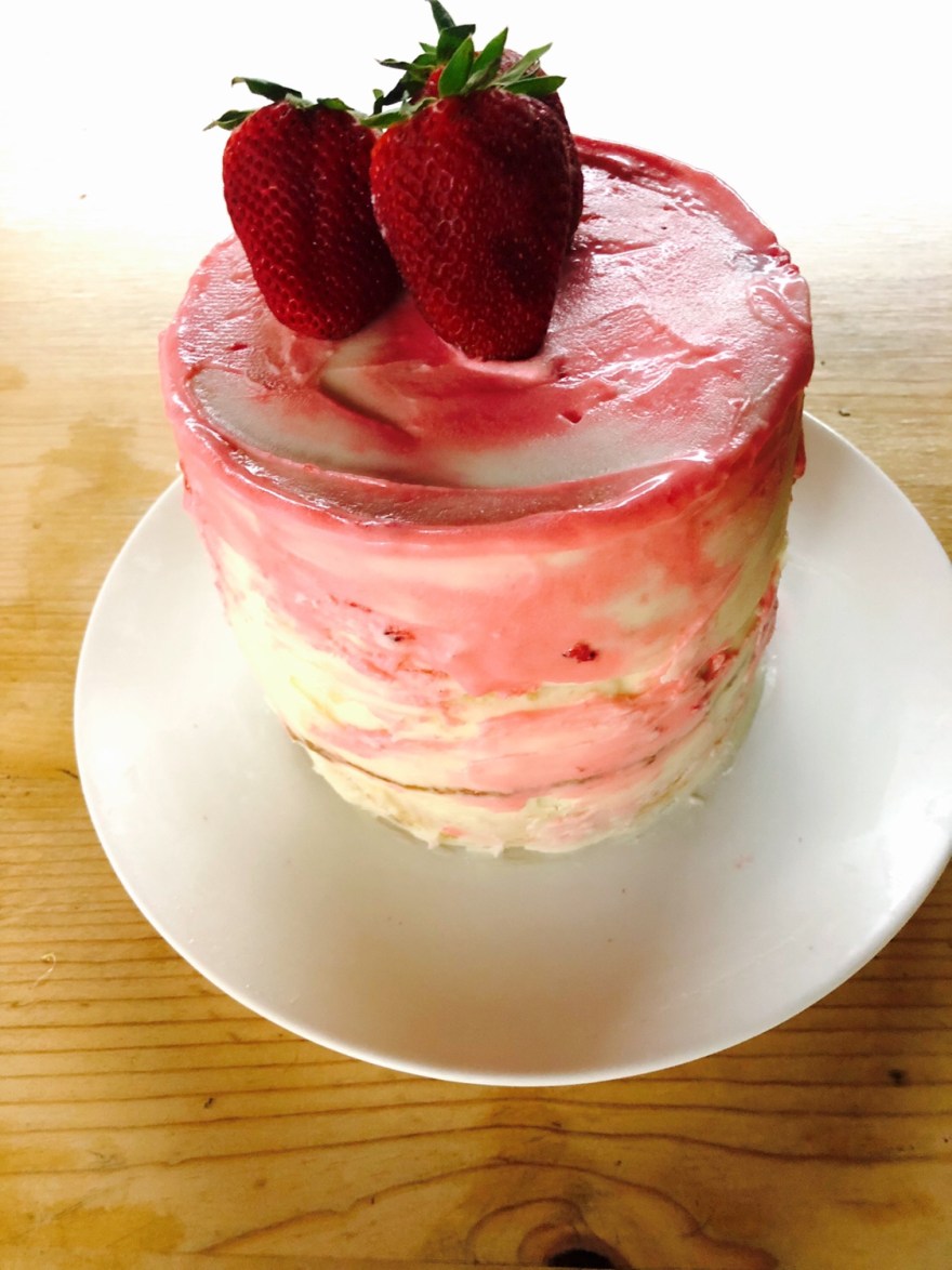 A honey and cream cheese frosted vanilla cake filled with whipped cream and strawberries.
