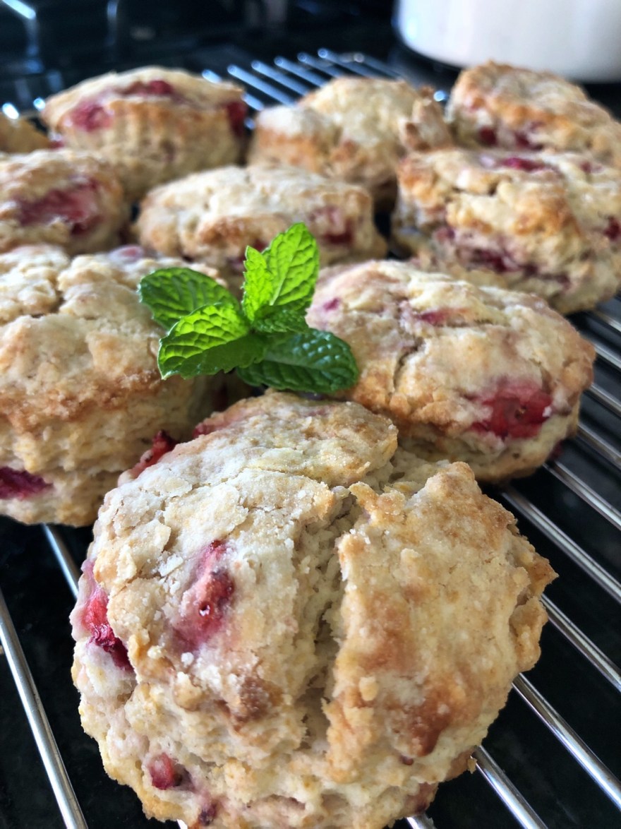 Bake the scones for 12 to 15 minutes, until bronzed at the edges and the strawberry juices are trickling out of the biscuits in places. Cool in pan for a minute, then transfer to a cooling rack. Serve warm or at room temperature.