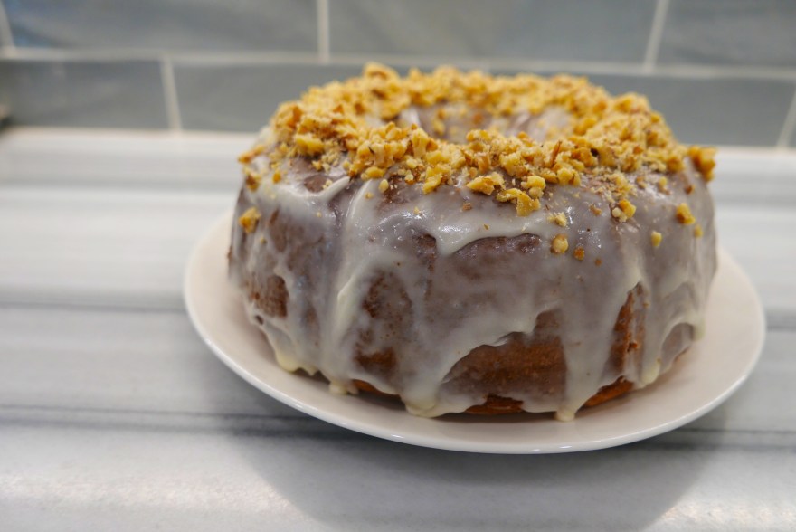 To make the glaze: Whisk together melted butter, powdered sugar, vanilla and milk. Drizzle on top of cooled cake and top with additional chopped walnuts.