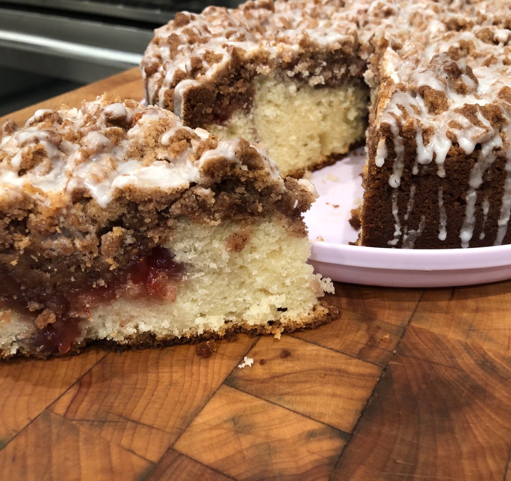 Pour batter into the prepared pan. Place dollops of preserves on top of the cake batter & cut a knife through to create swirls. Sprinkle the streusel on top.