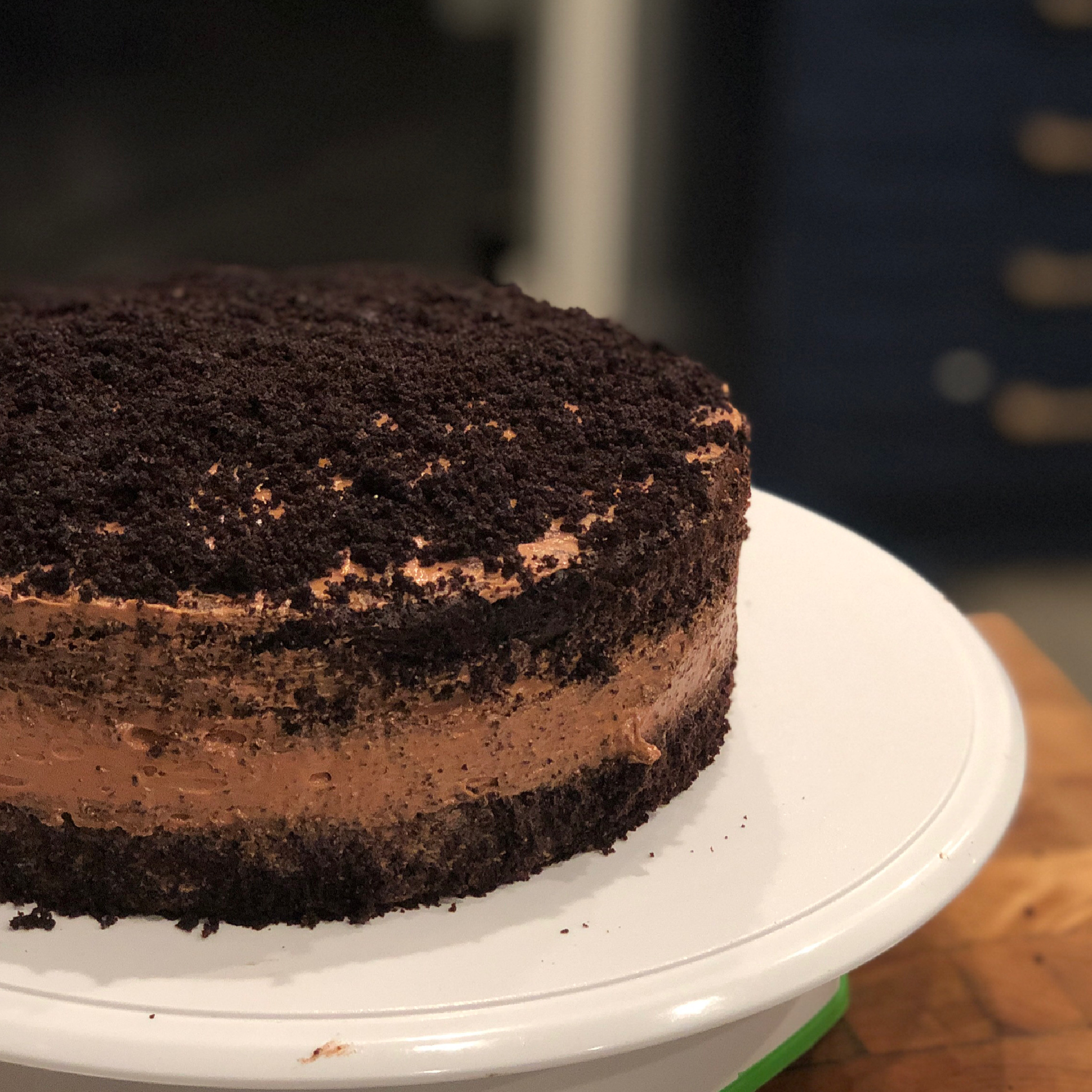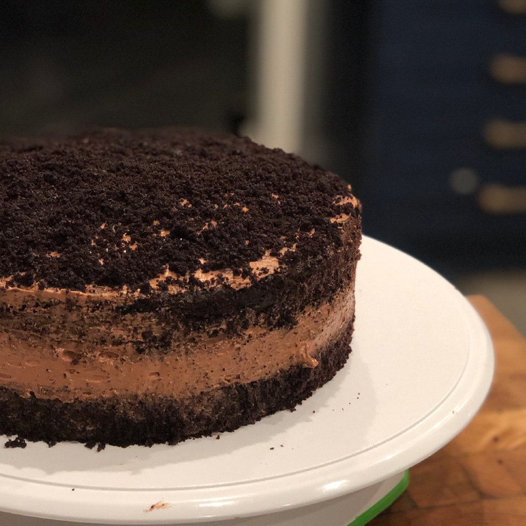 To decorate my cake, I trimmed the layers to level them and put the excess cake into the food processor to make crumbs.